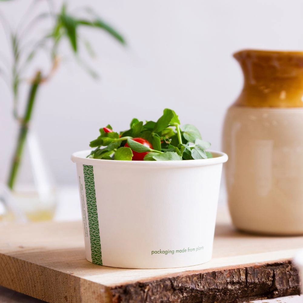 Contenitore in cartoncino bianco con motivo verde a lato, rivestito all'interno da una lamina di PLA, utilizzabile con cibi caldi e freddi (-25°C +100°C). Ideale per l'asporto di zuppe e cibi liquidi grazie ala possibilità di usarlo in combinazione un coperchio stagno per cibi caldi, evitando di far fuoriuscire liquido durante il trasporto
