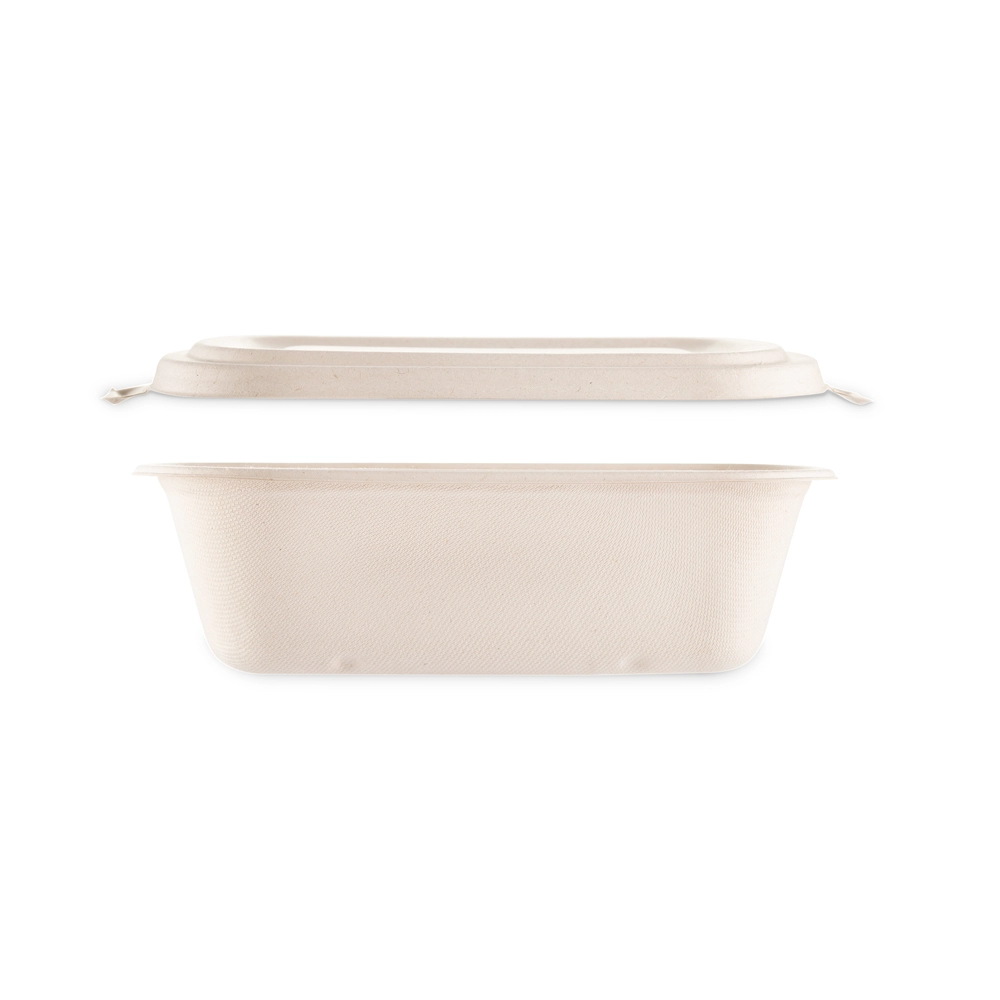 Contenitore e coperchio sono realizzati in polpa di cellulosa, una materia prima ricavata dagli scarti della lavorazione della fibra della canna da zucchero, biodegradabile e compostabile certificata Ok Compost.