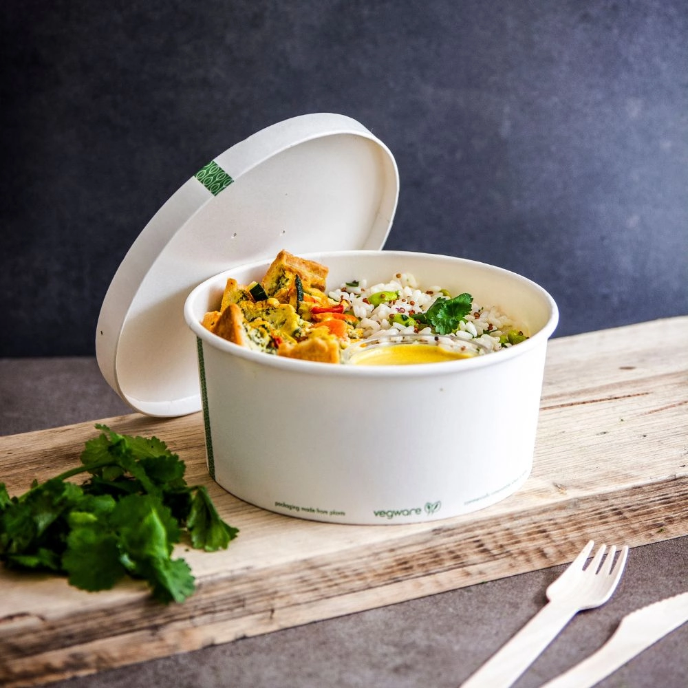 Ciotole realizzate in cartoncino e rivestite internamente da uno strato di bioplastica PLA. Da utilizzare sia con cibi caldi che freddi (non utilizzare il coperchio trasparente per cibi caldi).