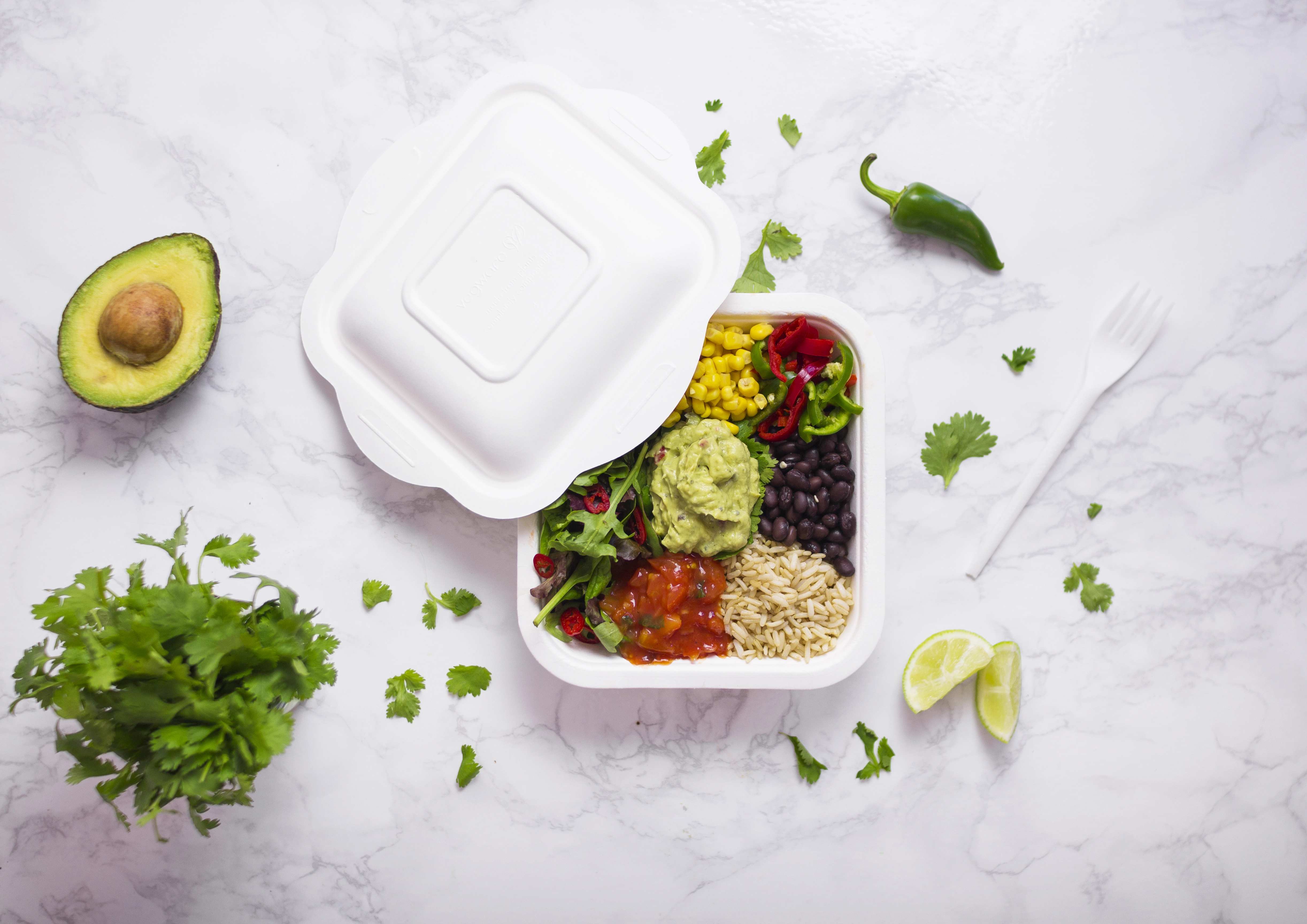 Questo contenitore da asporto è realizzato in polpa di cellulosa pressata, un materiale rinnovabile ricavato dalla canna da zucchero.