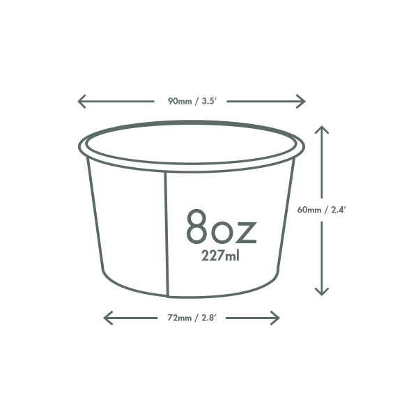 Contenitore in cartoncino bianco con motivo verde su un lato, rivestito all'interno da una lamina di PLA, utilizzabile con cibi caldi e freddi.