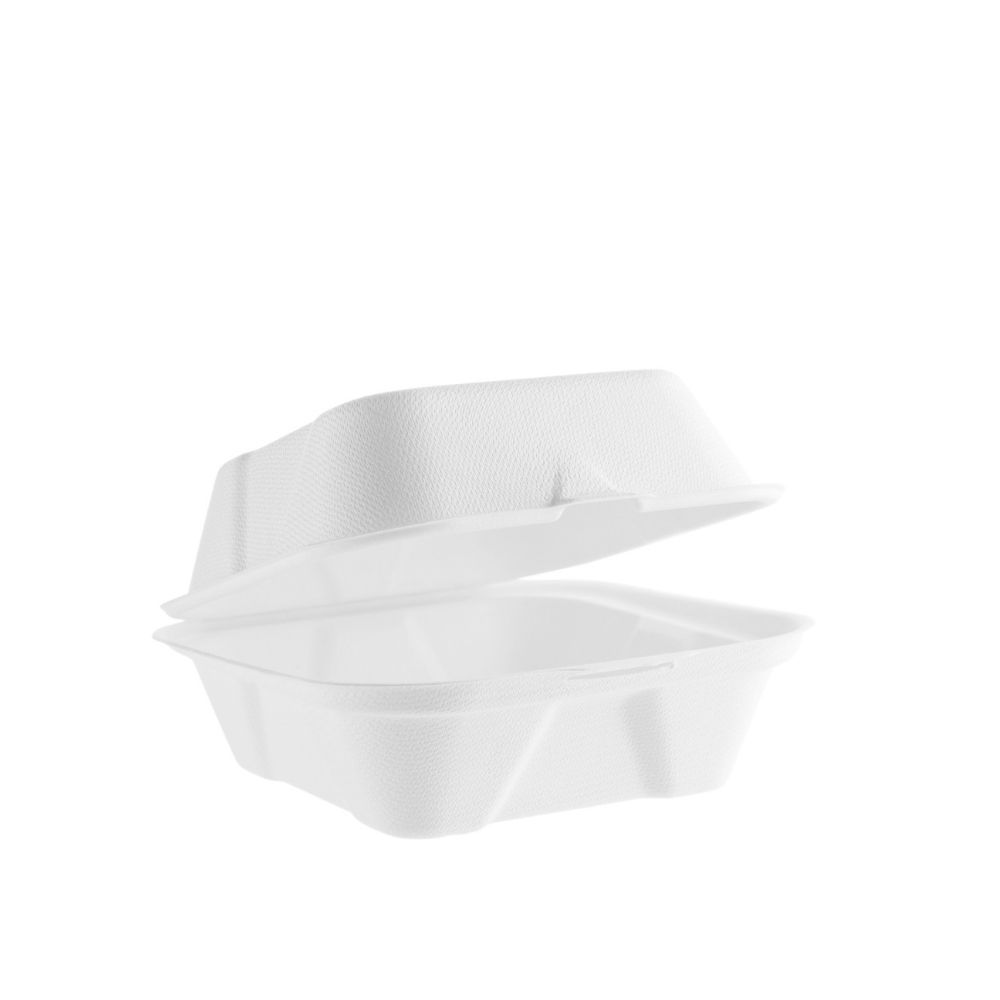 Contenitore a conchiglia in cellulosa. La chiusura con clip lo rende ottimo per il take away di panini, patatine fritte, street food e altri cibi non liquidi.