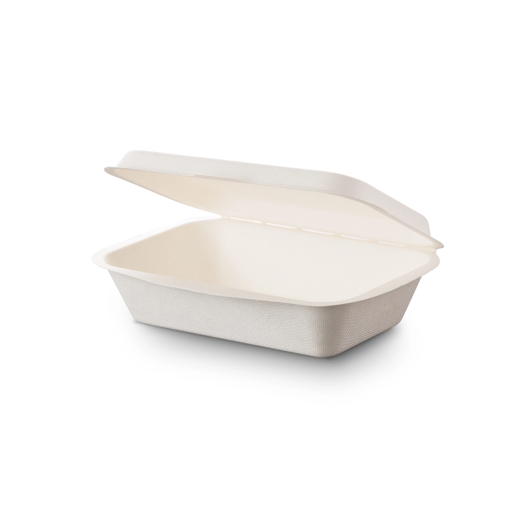 Questo contenitore da asporto è realizzato in polpa di cellulosa pressata, un materiale rinnovabile ricavato dalla canna da zucchero.