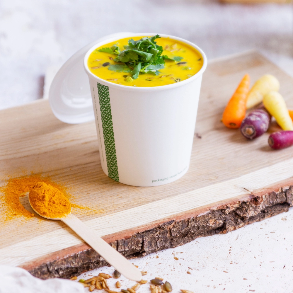 Contenitore in cartoncino bianco con motivo verde a lato, rivestito all'interno da una lamina di PLA, utilizzabile con cibi caldi e freddi (-25°C +100°C). Ideale per l'asporto di zuppe e cibi liquidi grazie ala possibilità di usarlo in combinazione un coperchio stagno per cibi caldi, evitando di far fuoriuscire liquido durante il trasporto