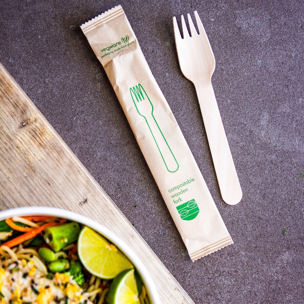 Forchetta in legno imbustata in un sacchetto di carta kraft opaco, che permette di garantire un maggiore igiene.