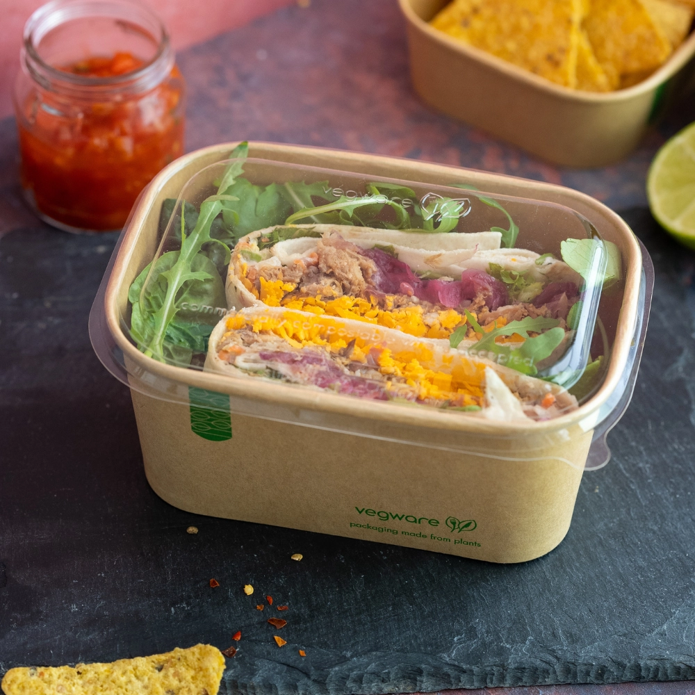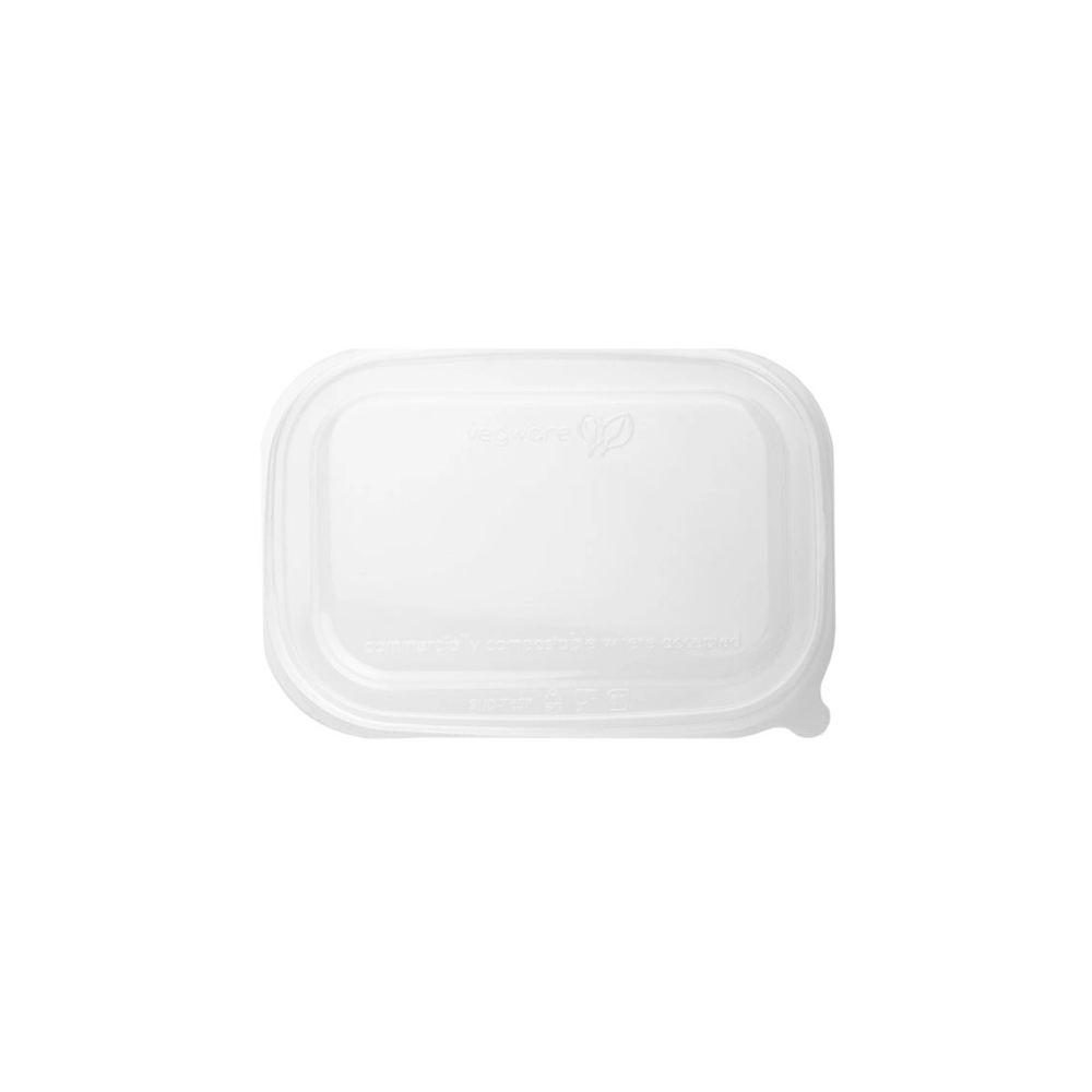 Coperchio PLA per contenitori quadrati in cartoncino kraft della linea RTC. Questo coperchio trasparente è utilizzabile solo con i cibi freddi come insalatone, paste fredde e frutta.