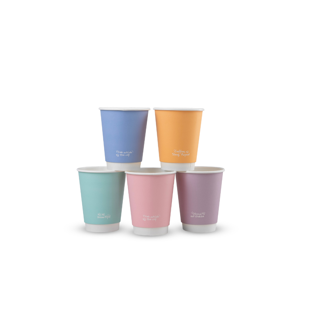 Realizzati in cartoncino da fonti sostenibili a doppio strato con laminatura in PLA all'interno. Adatti a contenere sia bevande calde che fredde, assortiti in cinque colori super cool!