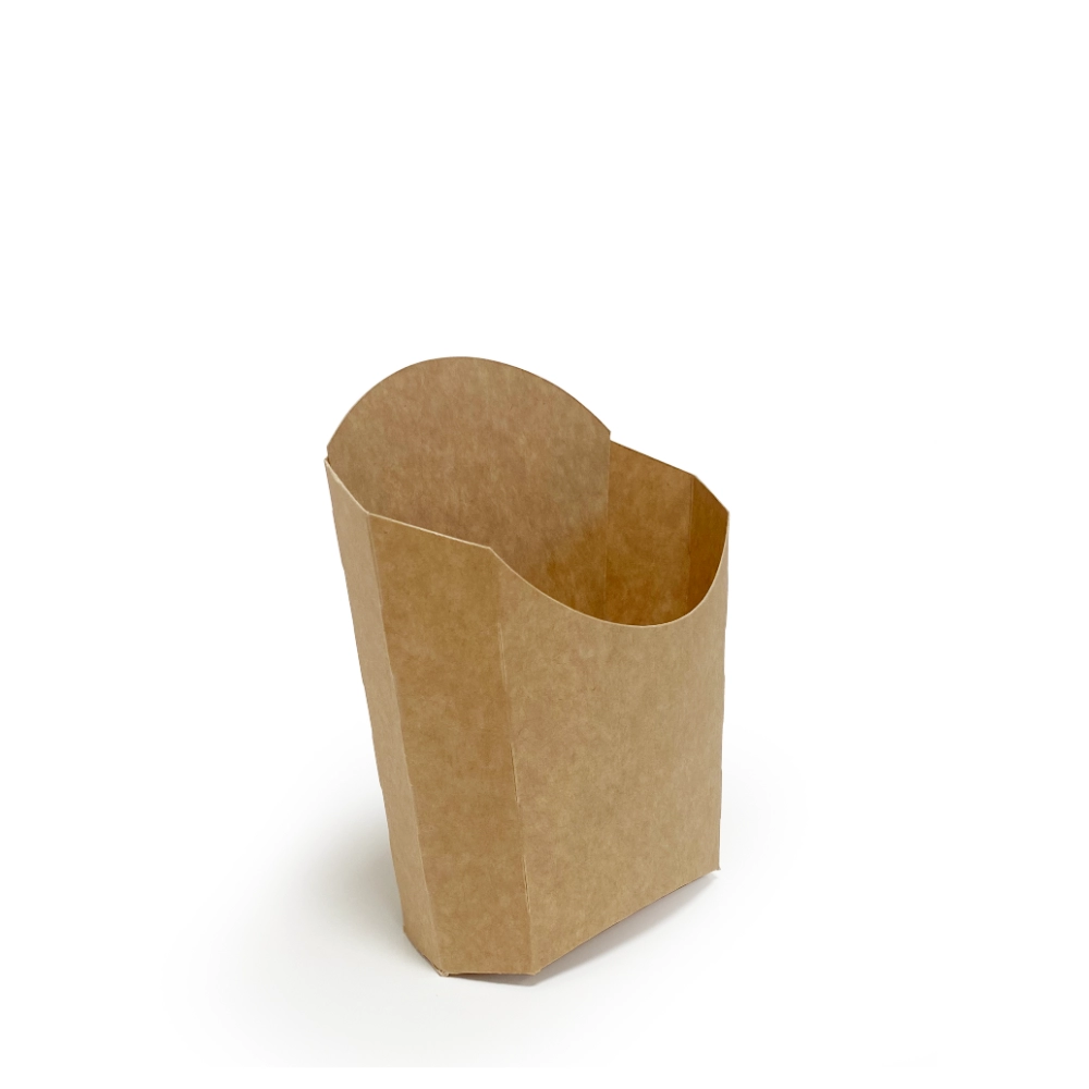 Contenitore color avana pratico e sostenibile pensato per l'asporto di cibi caldi come patatine fritte, crocchette, nuggets e altri stuzzichini.