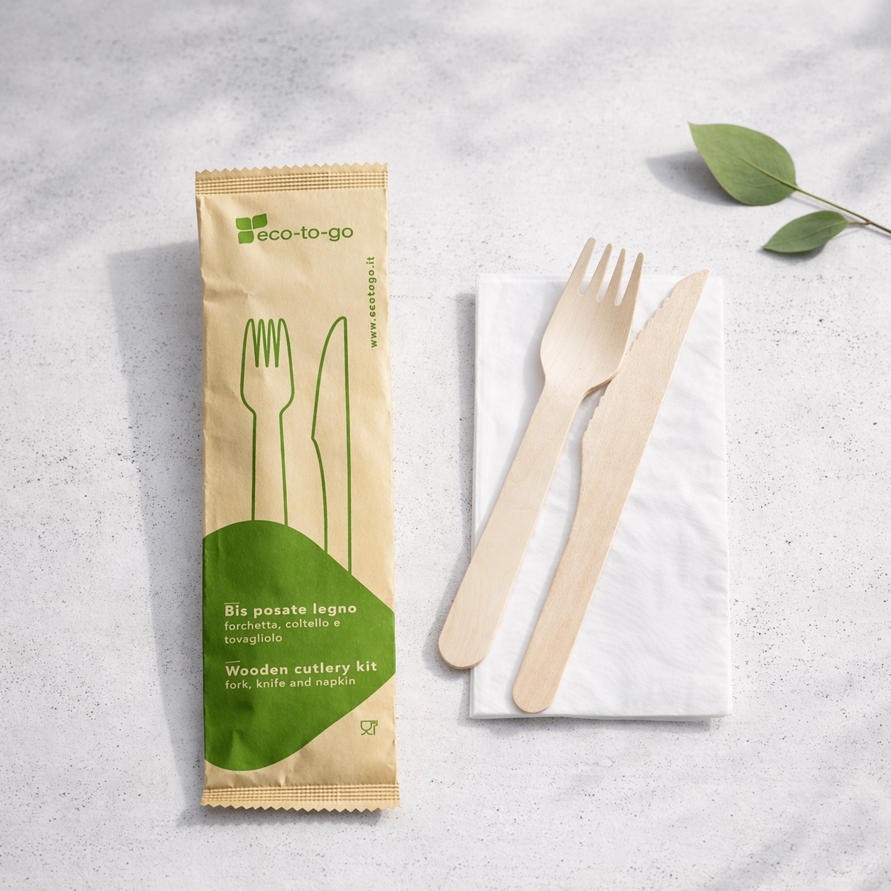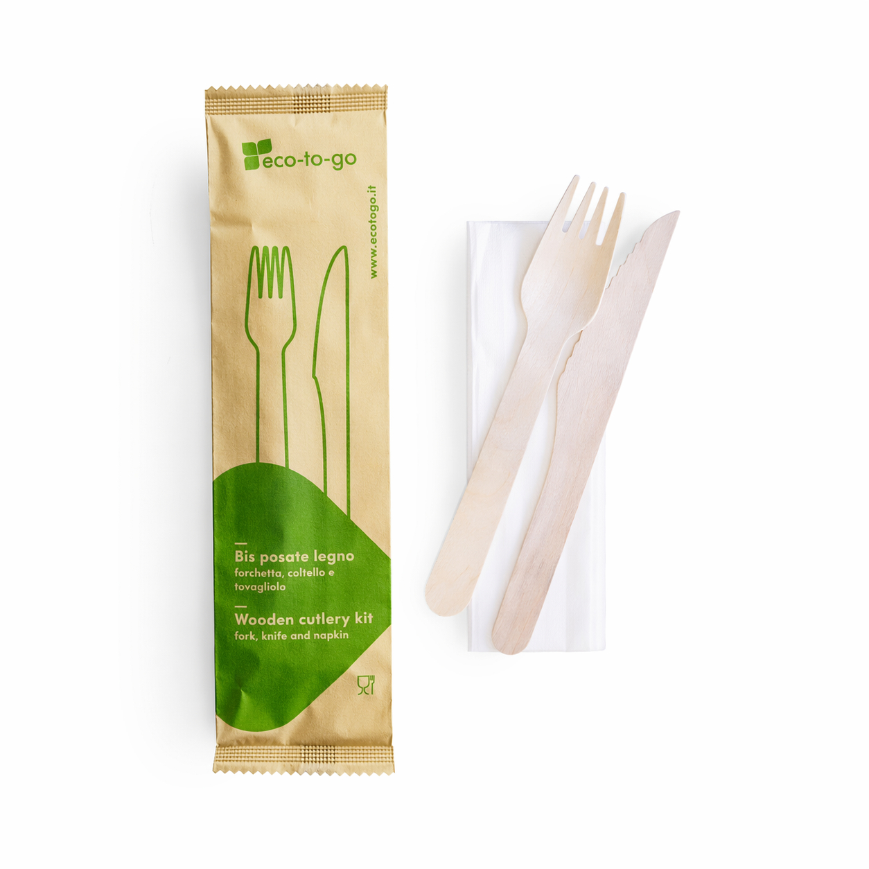 Kit di posate in legno biodegradabile e compostabile - coltello e forchetta - con tovagliolo. Le posate sono imbustate in un sacchetto di carta kraft opaco, che permette di garantire un maggiore igiene.