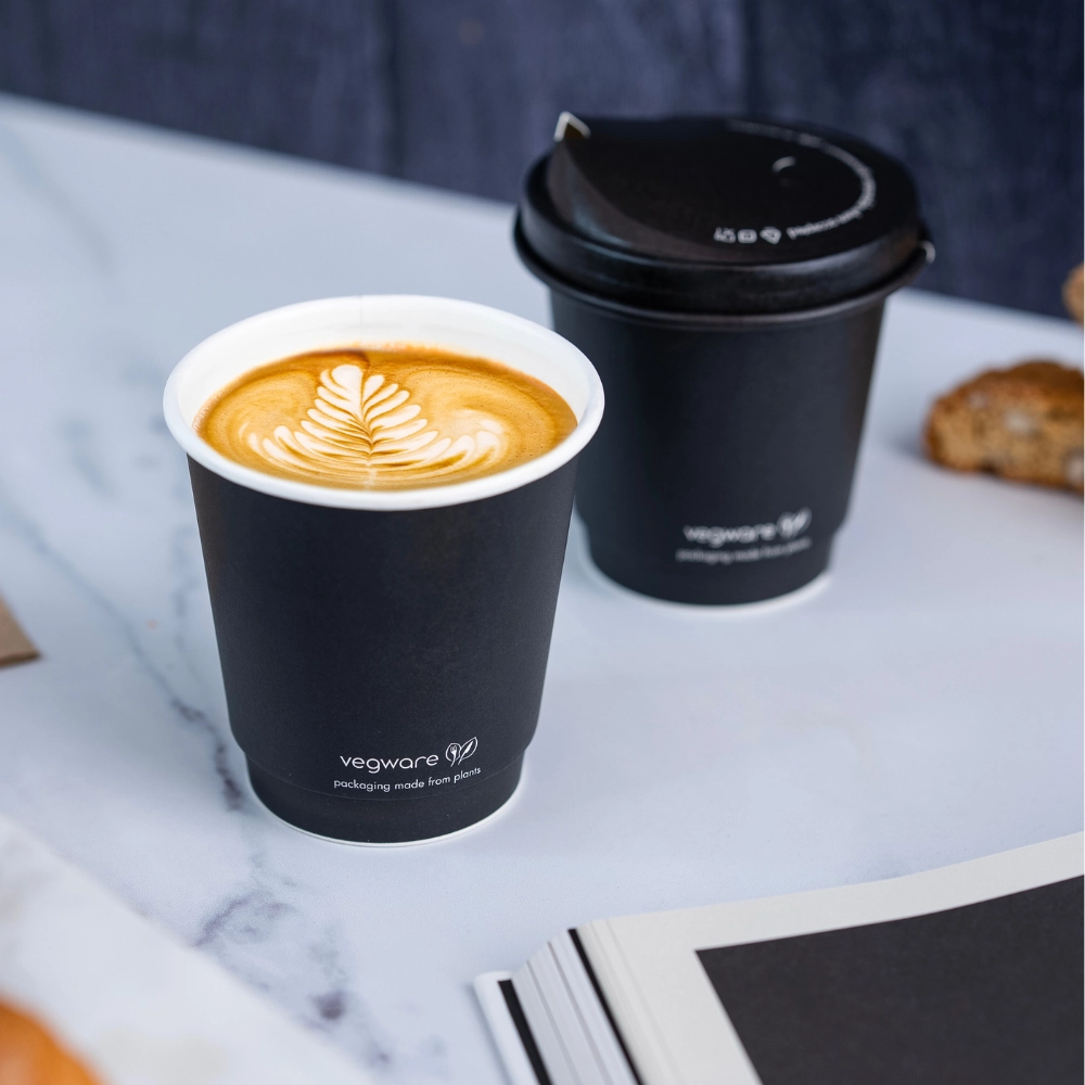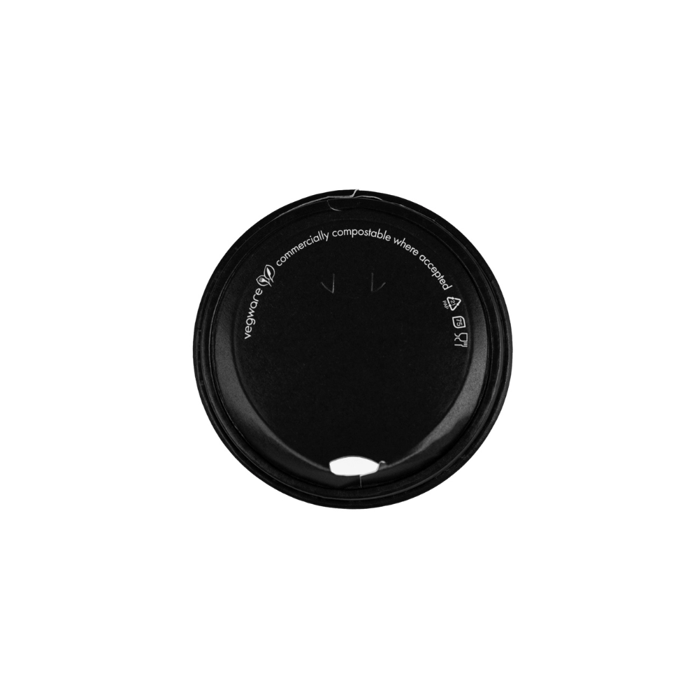 Realizzato in carta da fonti sostenibili con rivestimento acquoso, questo coperchio rappresenta l'innovazione nel mondo del to-go. La linguetta pull-back brevettata protegge il beccuccio rialzato durante il trasporto, per poi scoprirlo con un semplice gesto quando è il momento di gustare la tua bevanda. Design nero opaco sofisticato con logo Vegware a rilievo.