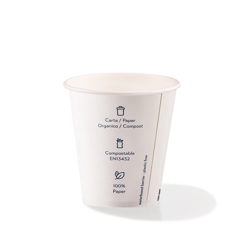 Realizzati in cartoncino senza laminatura in plastica all'interno. Sono ugualmente adatti a contenere sia bevande calde e fredde, in quanto il cartoncino utilizzato è sottoposto ad un trattamento a base acqua che lo rende impermeabile (Water based barier)